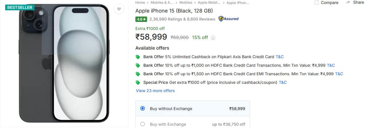 The Apple iPhone 15 (128 GB, Black) is now available on Flipkart at a special price. The premium phone is originally priced at Rs 69,900, it’s offered at Rs 58,999 after a 15 per cent discount.